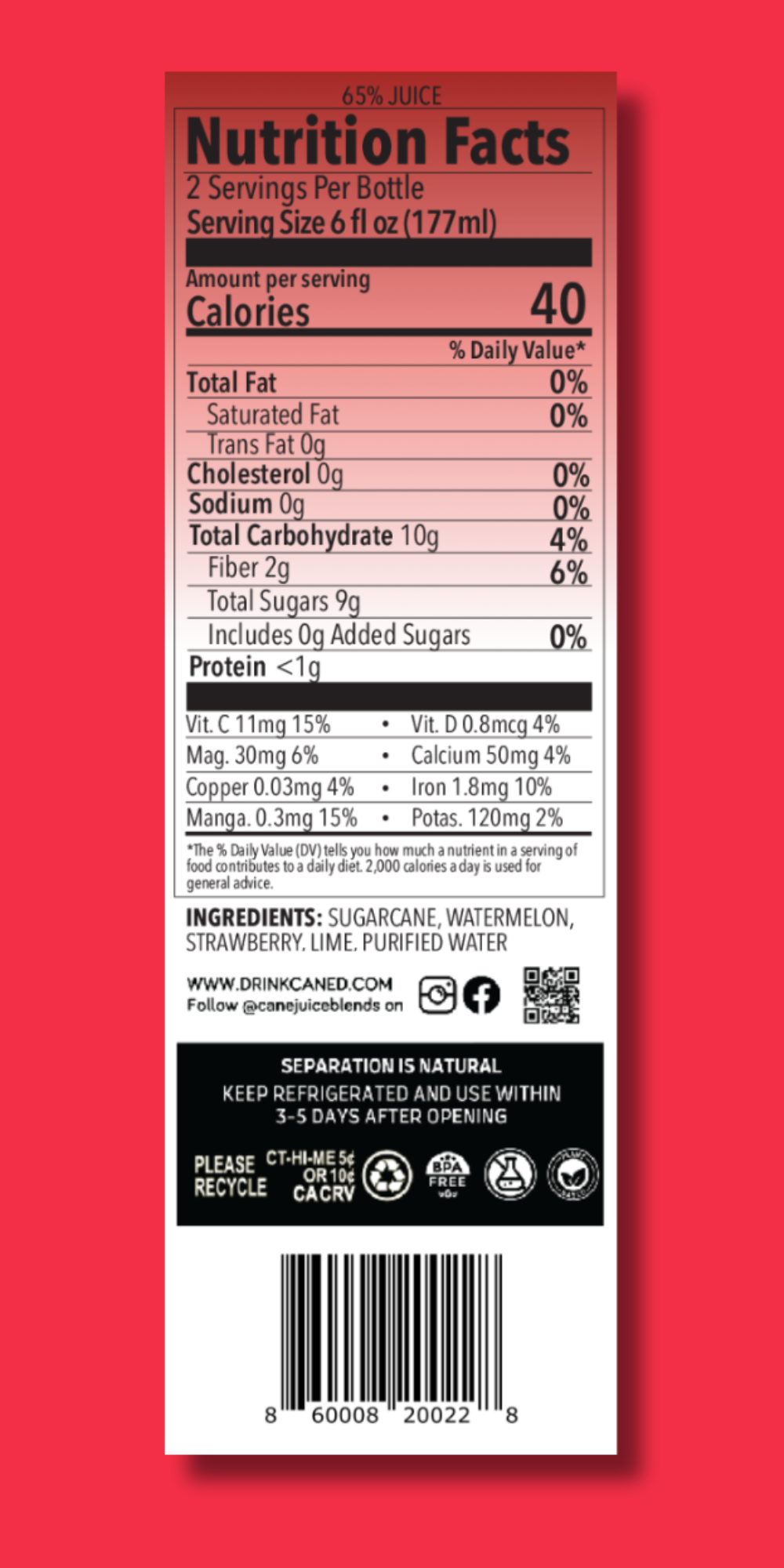 Our Juice Blends are 100% Natural, Cold Pressed with No Added Sugar. Our Cane Juice Blends only have the natural sugar from fruits and vegetable and are gluten free with no preservatives.