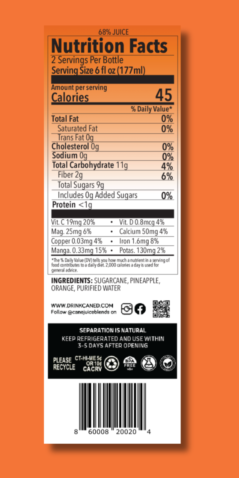 Our Juice Blends are 100% Natural, Cold Pressed with No Added Sugar. Our Cane Juice Blends only have the natural sugar from fruits and vegetable and are gluten free with no preservatives.